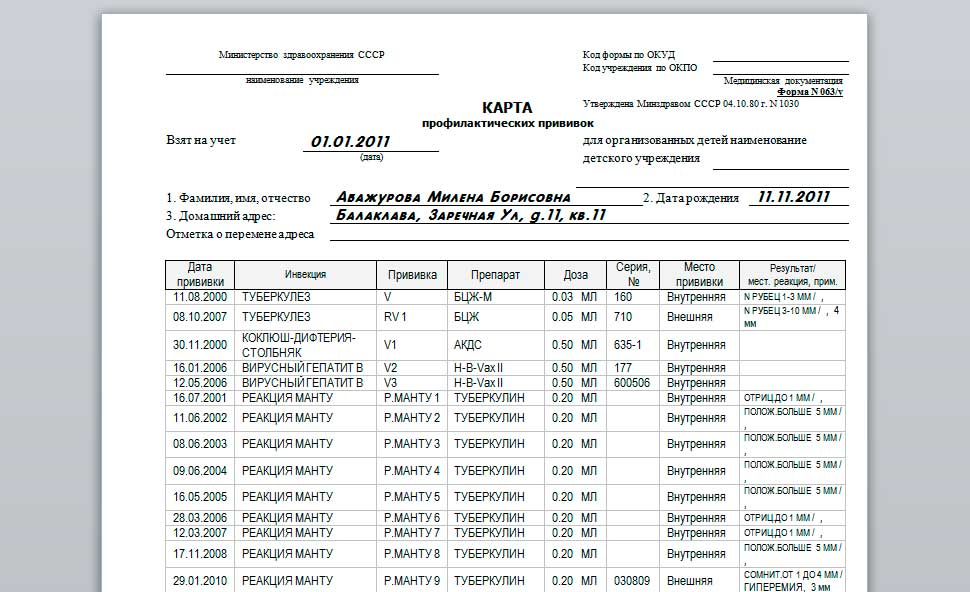 Форма 063/у разработана Минздравом в далёком 1980 году не претерпев с тех пор особых изменений. Она представляет собой документ альбомного вида, состоящий из двух листов. На первой странице указано её название – «Карта профилактических прививок», слева от которого располагается информация об учреждении системы здравоохранения, зачастую, в виде штампа. Ниже указаны дата взятия на учёт ребёнка и его данные с указанием домашнего адреса. Дальнейшая информация, размещённая с 1-й по 4-ю страницы документа, касается вакцинаций от таких заболеваний как: